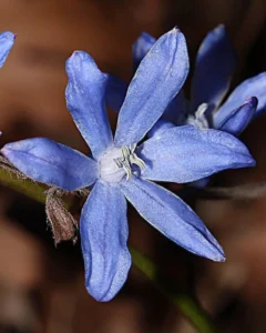 The flowers of Scilla lochiae exhibit a unique structural trait where the filaments are packed closely together. This creates a central cone that protects the reproductive organs from the harsh mountain elements. The deep blue tepals are fused at the base, forming a short perianth tube that is characteristic of the species.