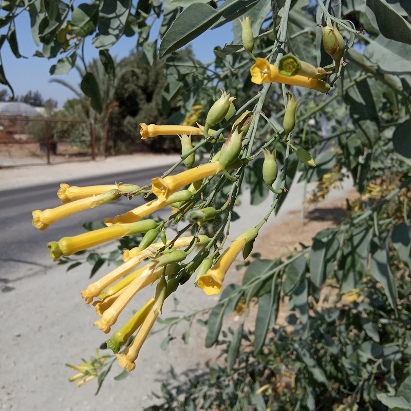 It is a naturalized, invasive, non endemic plant, encountered at an altitude of only up to 150 metres above the sea level, all around Cyprus, excluding the Central and NE region. It could be the only Nicotiana species in Cyprus, since the existence of Nicotiana rustica is questionable. A very common plant in Cyprus, or rather a shrub or short tree, it is also known as Nicotidentron glauca (nicotine light blue tree from Greek “δέντρον” and “γλαύκη”). It grows up to 3 metres. It belongs in the tobacco genus Nicotiana. All its parts are very toxic for human consumption. It blooms from February till November. It is mostly seen on the roadsides, as well as in urban areas, sidewalks, rocky and dry ground or abandoned fields. It basically grows on disturbed and abandoned areas. It is drought tolerant.